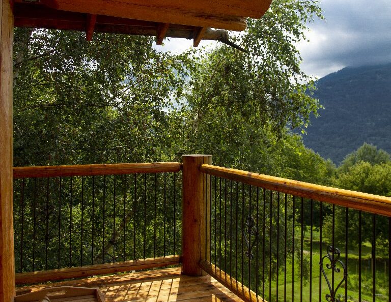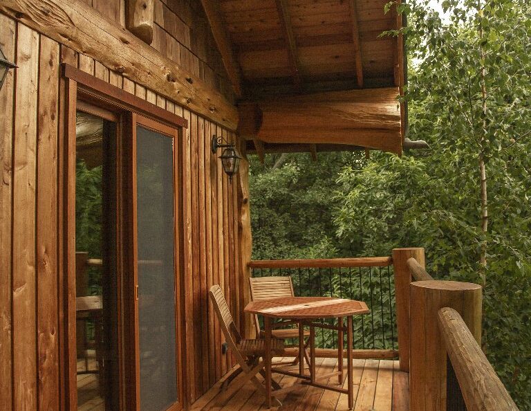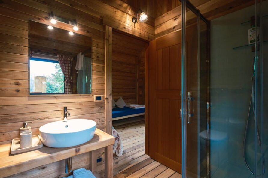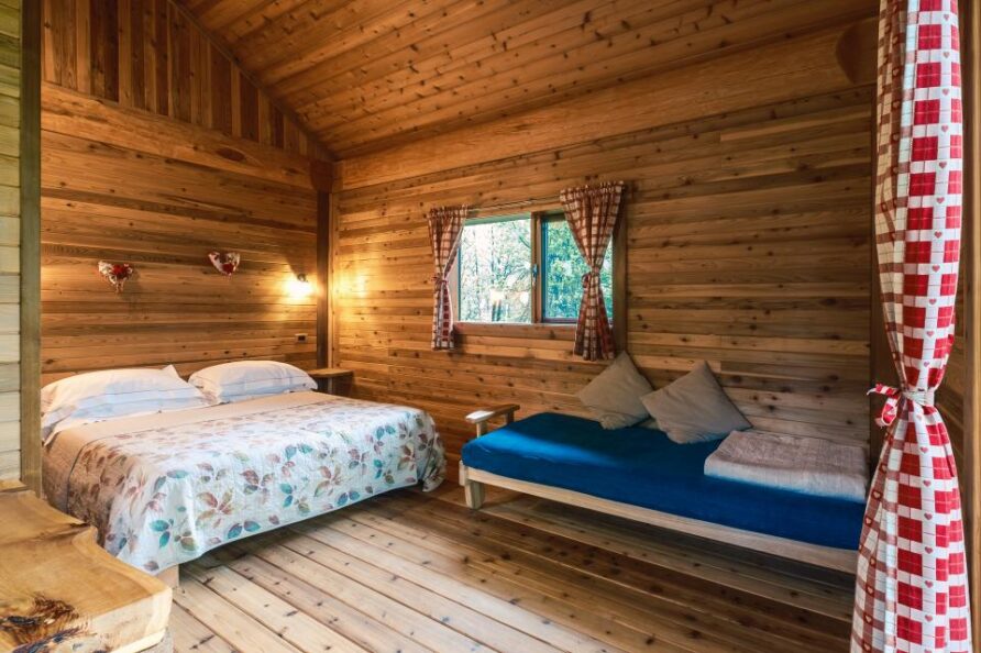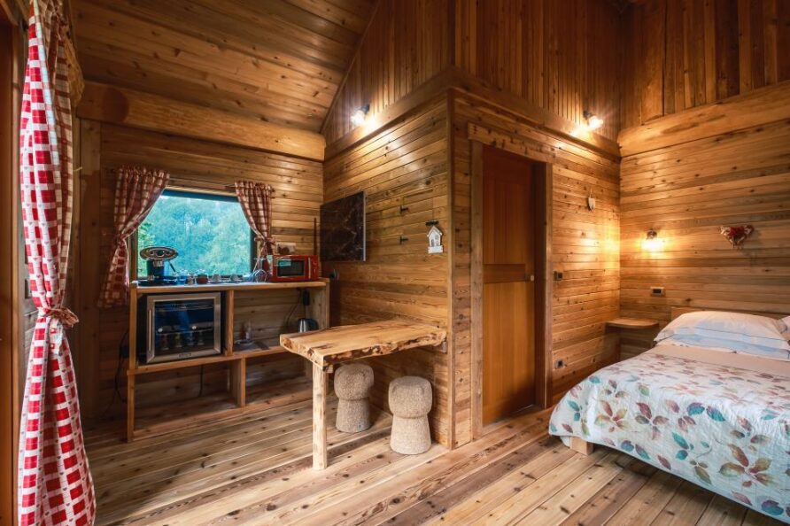 Qui, l’aria è fresca e pulita, profumata di legno e foglie. I raggi del sole filtrano tra le fronde, disegnando giochi di luce sui pavimenti in legno naturale, e ogni dettaglio racconta una storia di semplicità e armonia.
